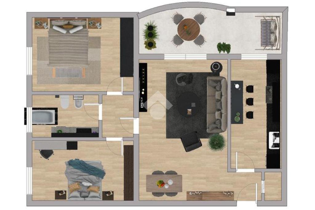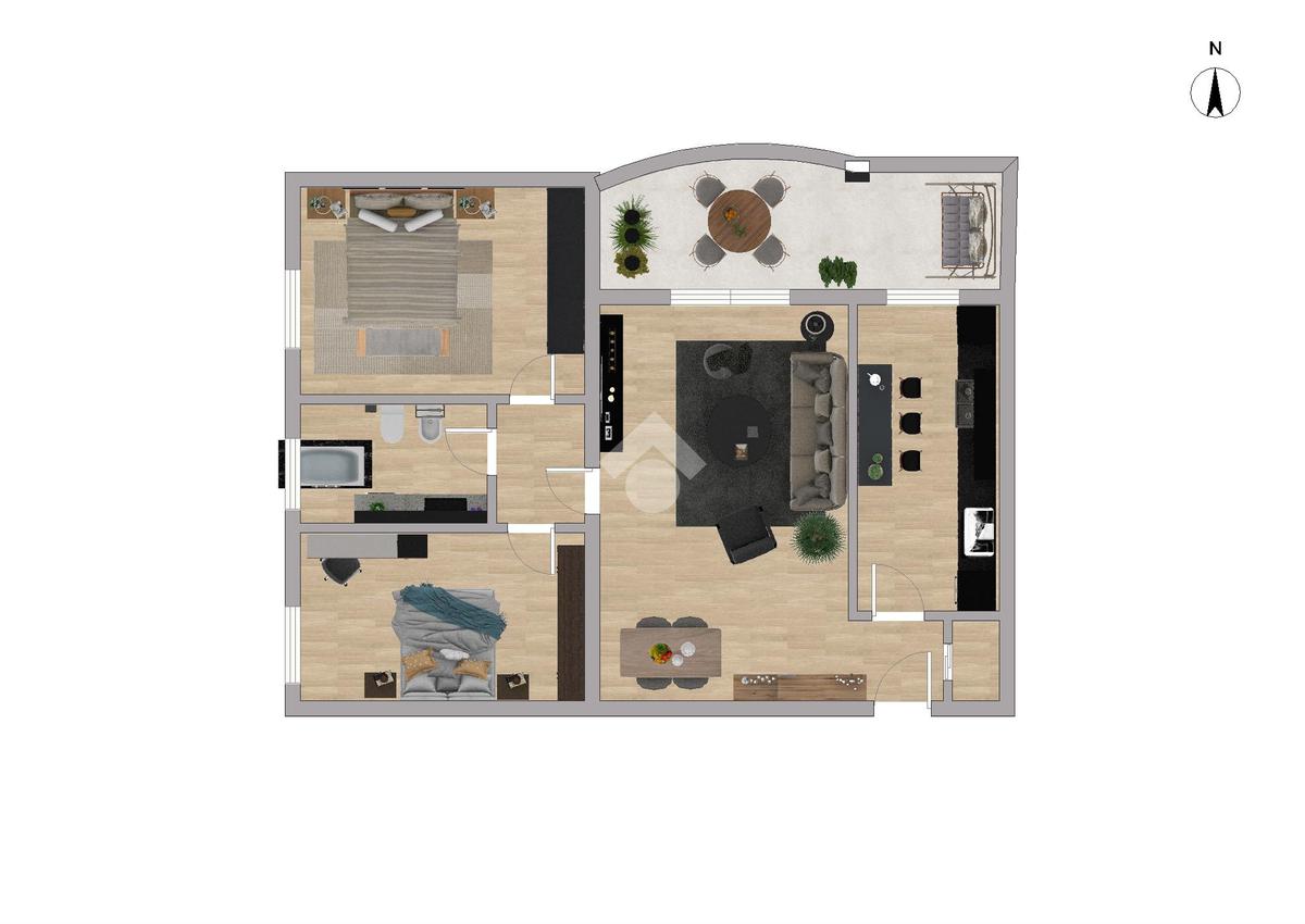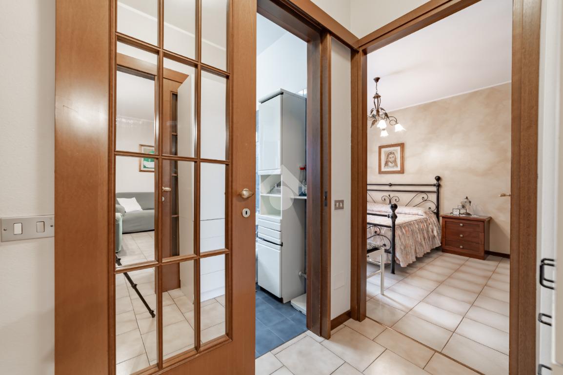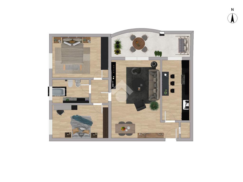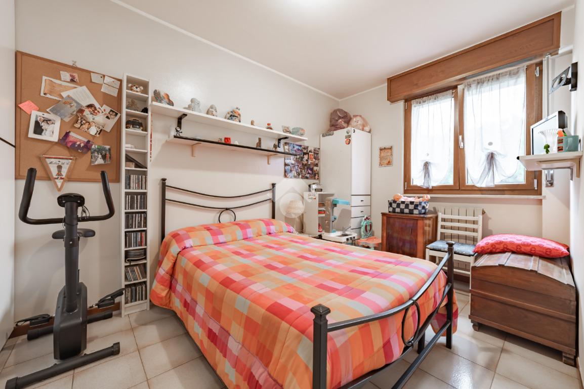 Posta al secondo piano con doppia esposizione (sud - ovest), questa soluzione si presenta con ingresso sul disimpegno che permette l’accesso ad un comodo ripostiglio, alla cucina abitabile ad al soggiorno; questi ultimi due ambienti sono entrambi dotati di porte finestre che conducono all’ampia balconata, profonda, completamente e molto ben sfruttabile. La zona notte, completamente esposta verso sud, è invece composta da cameretta, camera matrimoniale e bagno finestrato con vasca che funge anche da doccia.