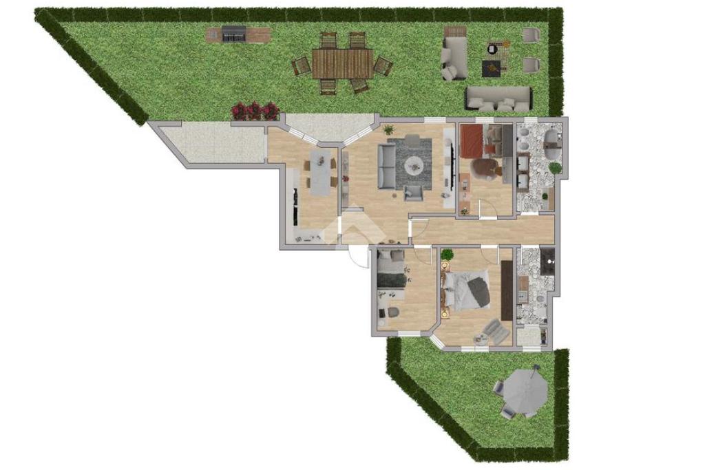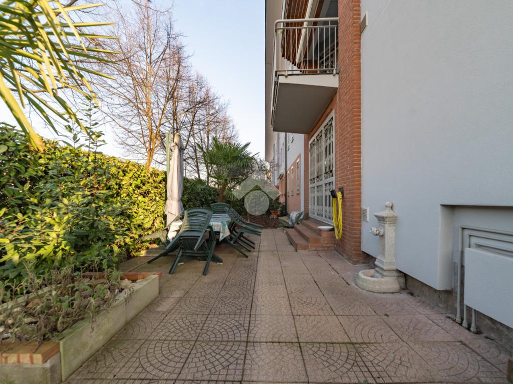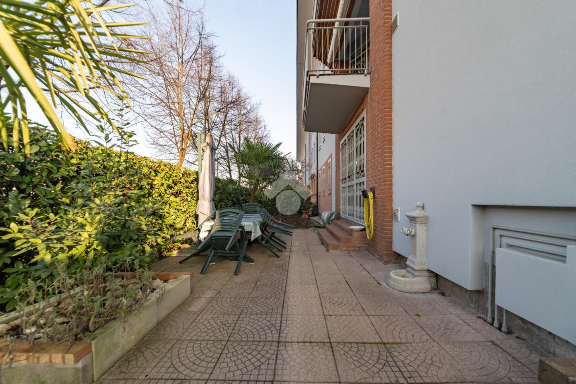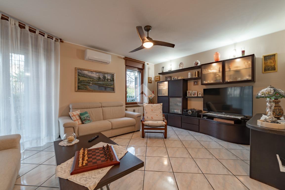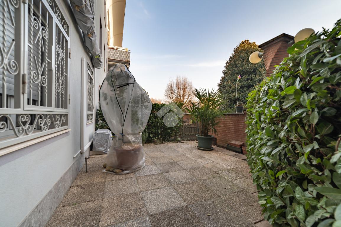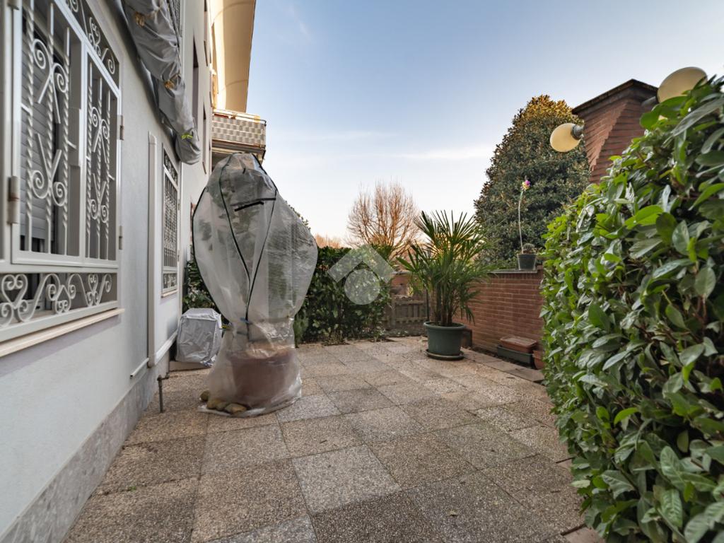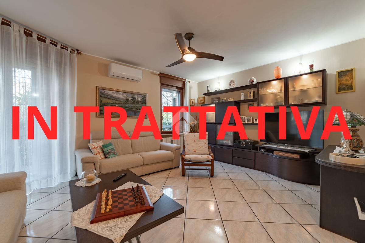 Posta al piano terreno con doppia esposizione (nord - sud), la soluzione da subito colpisce per il fatto di avere a disposizione due porzioni di giardino in uso esclusivo, una delle quali di ottime dimensioni e completamente attrezzata; l’ingresso avviene direttamente sul soggiorno dotato di finestra e porta finestra che permette l’accesso sia ad una piccola balconata coperta che al giardino lato nord. La cucina, pienamente abitabile, è subito adiacente, con due porte finestre comunicanti con altrettanti balconcini completamente coperti ed incassato, in uno dei quali trova posto una caldaia a condensazione ad alto rendimento, messa in opera circa due anni fa. La zona notte presenta un comodo disimpegno, una camera matrimoniale con finestra e porta finestra sul giardino posteriore, due camerette, una delle quali con porta finestra sulla porzione di giardino lato sud, il bagno principale di generosissime dimensioni, finestrato con vasca da bagno ed il bagno di servizio con cabina doccia e dotato di porta finestra con accesso ad un piccolo balconcino chiuso da un ulteriore serramento, particolarmente utile nella stagione fredda e piovosa.