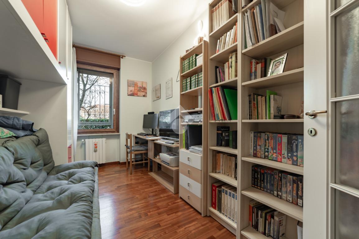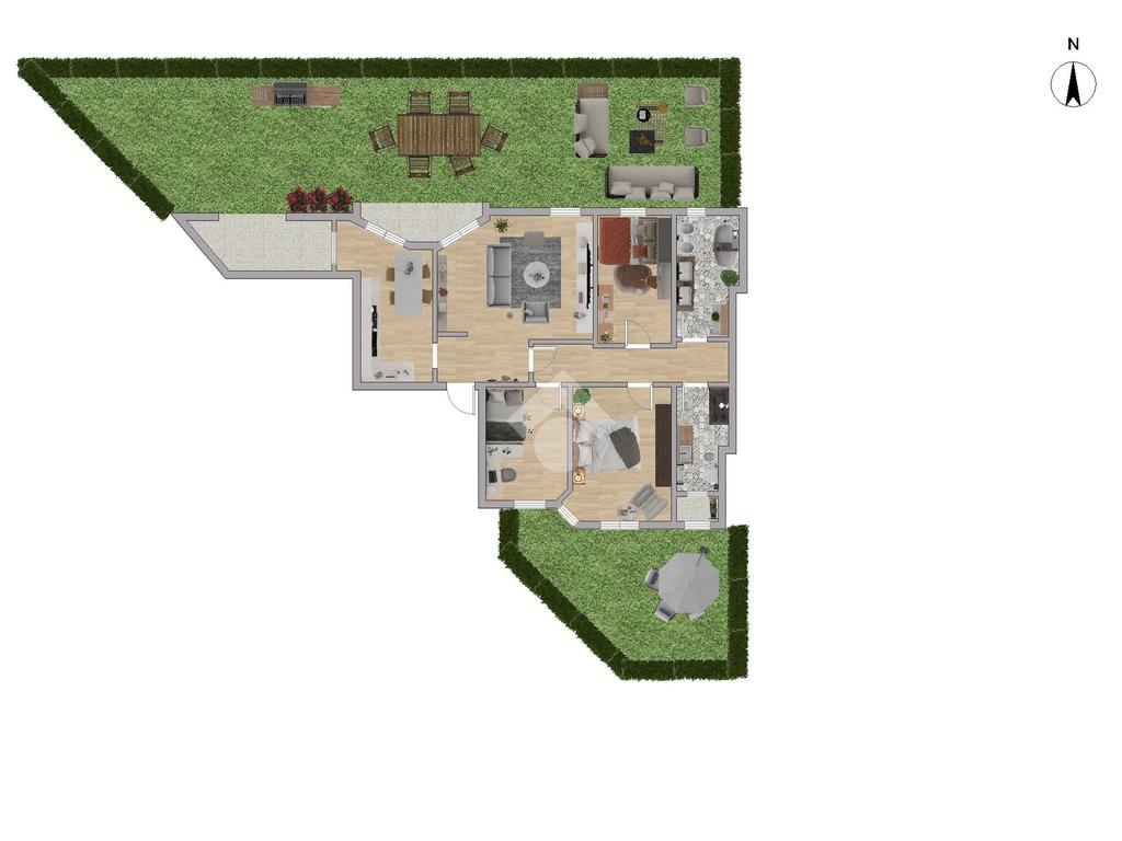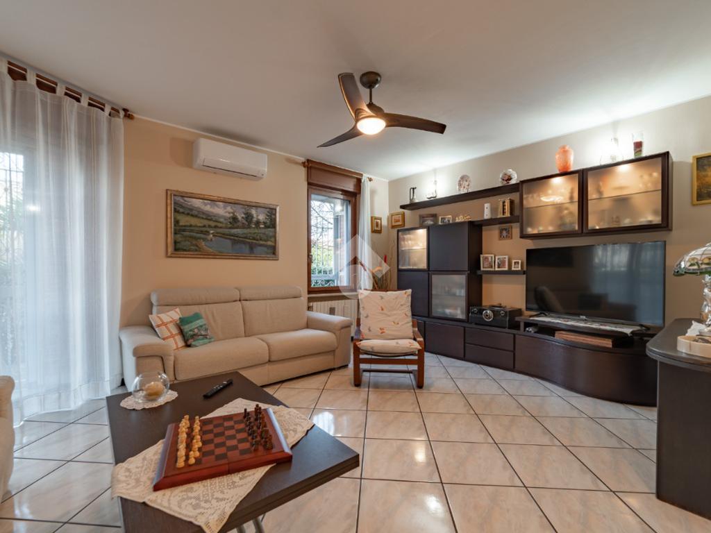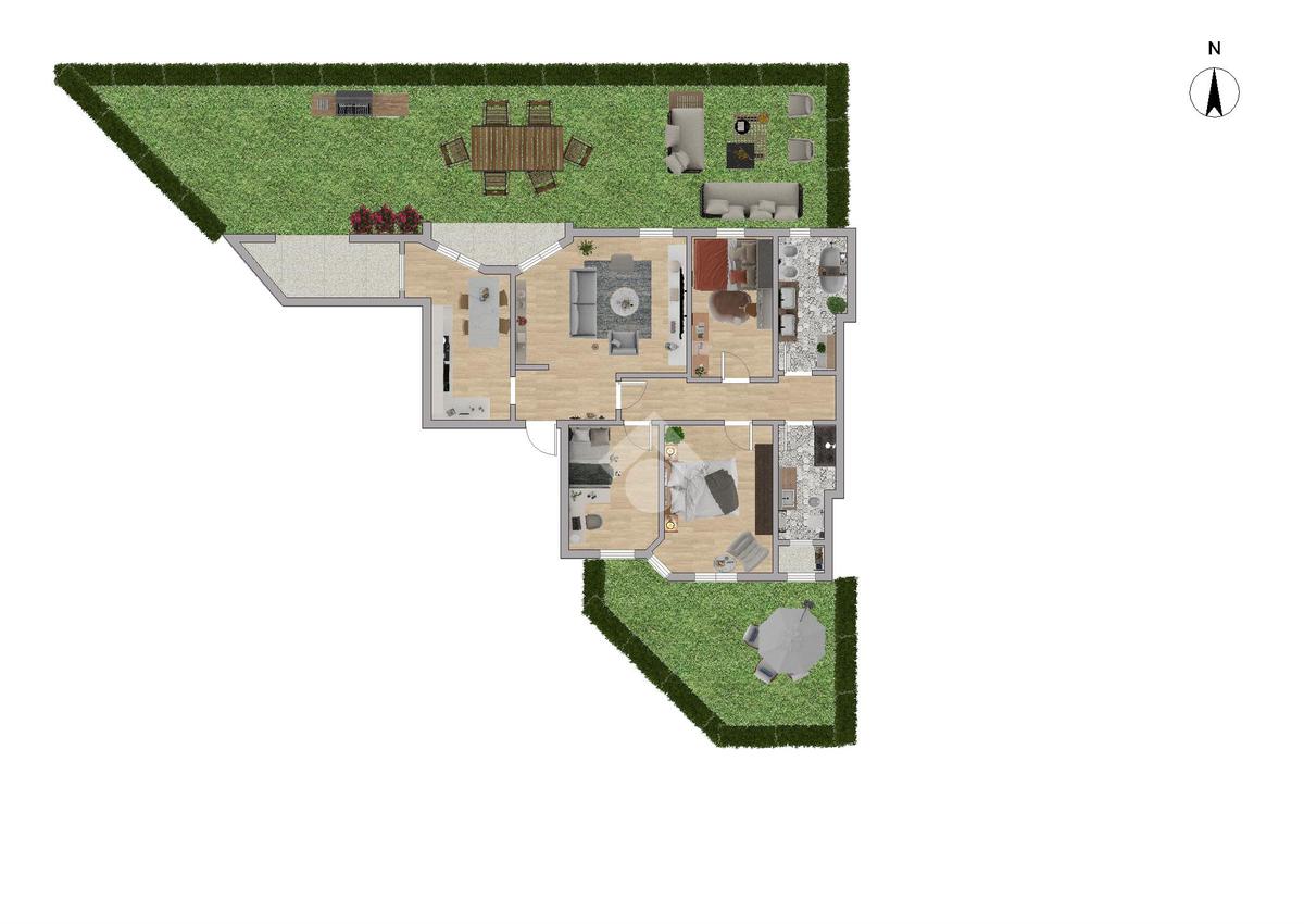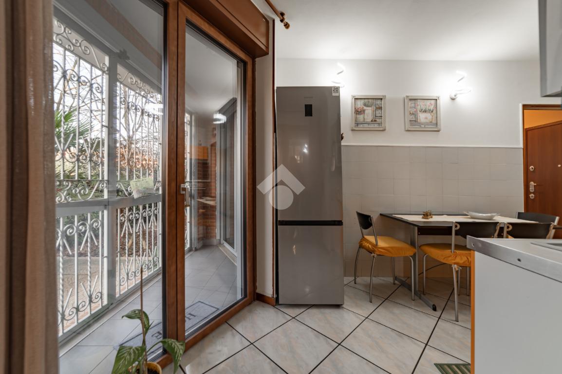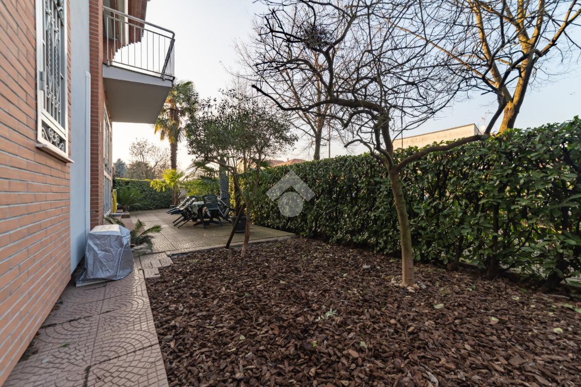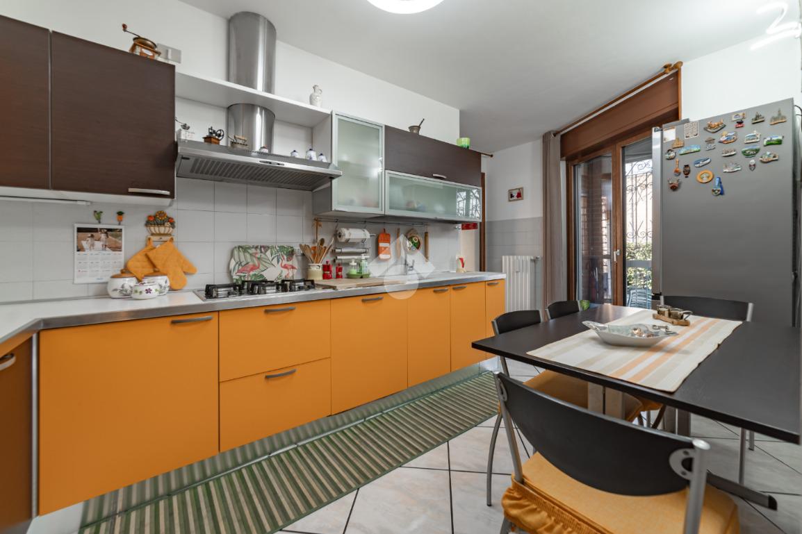 Posta al piano terreno con doppia esposizione (nord - sud), la soluzione da subito colpisce per il fatto di avere a disposizione due porzioni di giardino in uso esclusivo, una delle quali di ottime dimensioni e completamente attrezzata; l’ingresso avviene direttamente sul soggiorno dotato di finestra e porta finestra che permette l’accesso sia ad una piccola balconata coperta che al giardino lato nord. La cucina, pienamente abitabile, è subito adiacente, con due porte finestre comunicanti con altrettanti balconcini completamente coperti ed incassato, in uno dei quali trova posto una caldaia a condensazione ad alto rendimento, messa in opera circa due anni fa. La zona notte presenta un comodo disimpegno, una camera matrimoniale con finestra e porta finestra sul giardino posteriore, due camerette, una delle quali con porta finestra sulla porzione di giardino lato sud, il bagno principale di generosissime dimensioni, finestrato con vasca da bagno ed il bagno di servizio con cabina doccia e dotato di porta finestra con accesso ad un piccolo balconcino chiuso da un ulteriore serramento, particolarmente utile nella stagione fredda e piovosa.