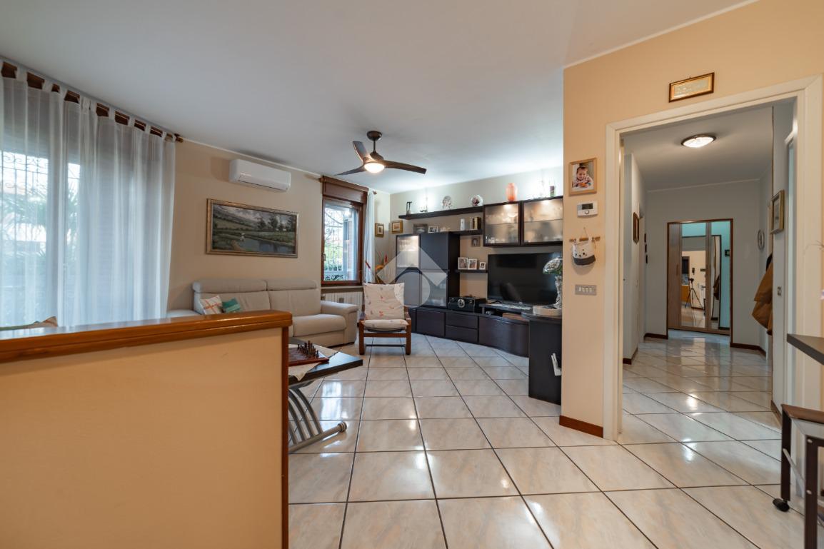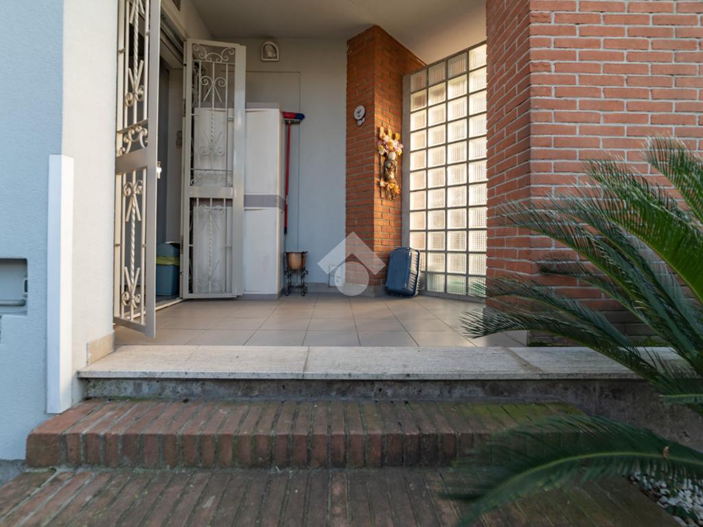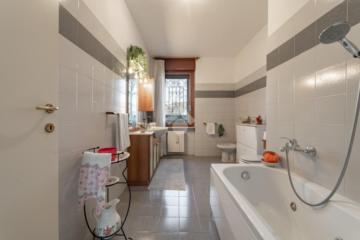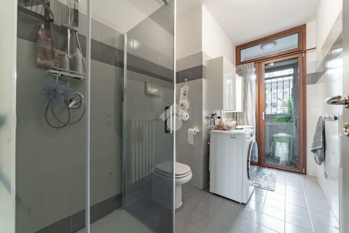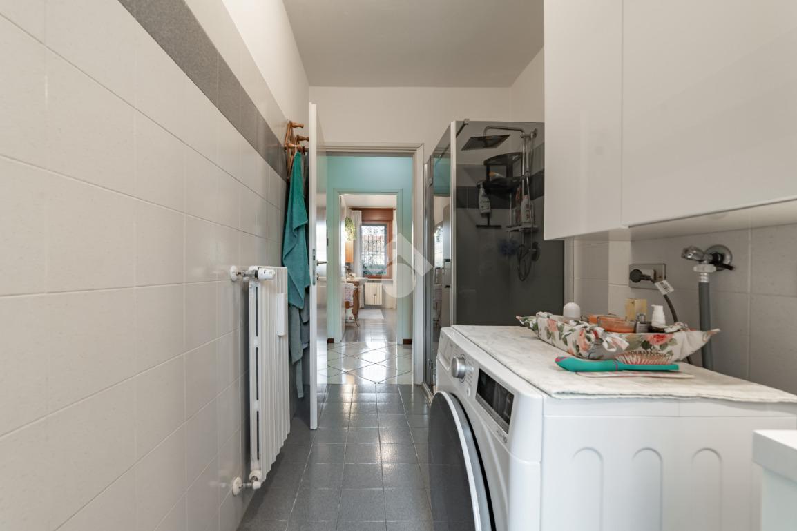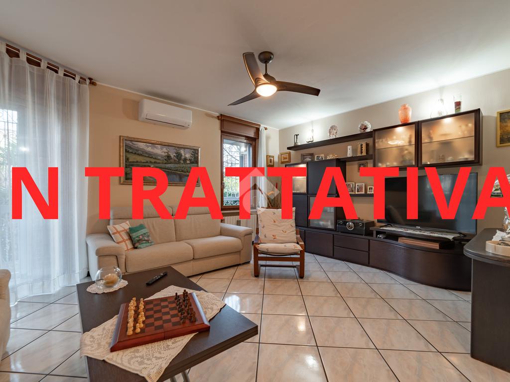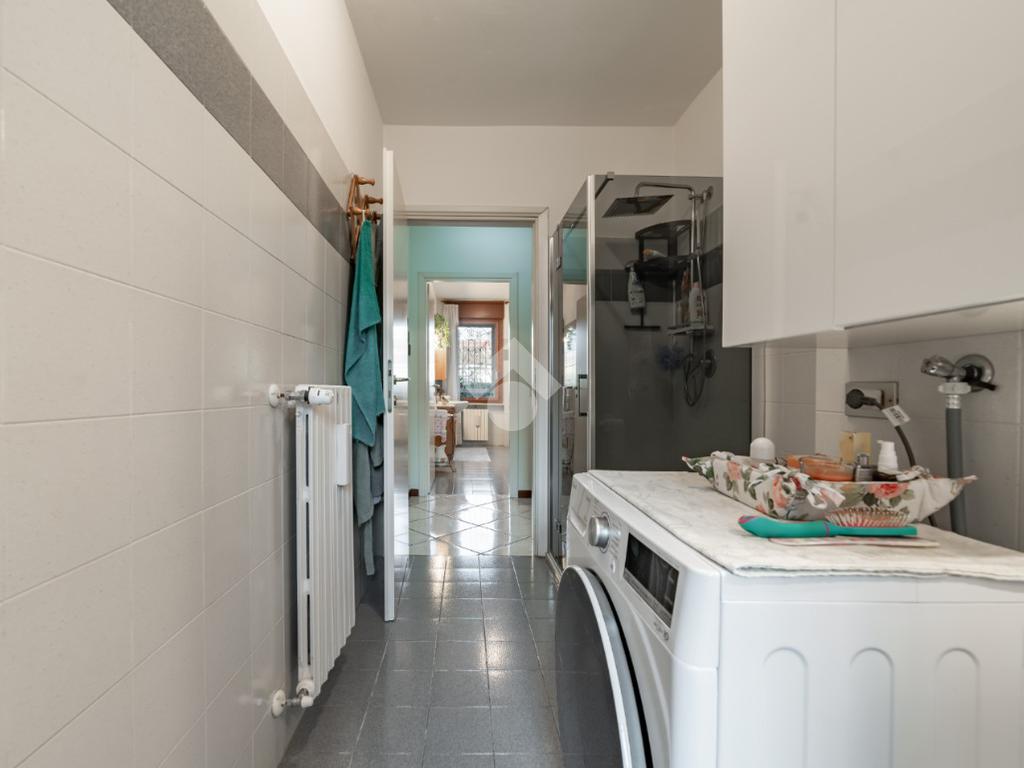 Posta al piano terreno con doppia esposizione (nord - sud), la soluzione da subito colpisce per il fatto di avere a disposizione due porzioni di giardino in uso esclusivo, una delle quali di ottime dimensioni e completamente attrezzata; l’ingresso avviene direttamente sul soggiorno dotato di finestra e porta finestra che permette l’accesso sia ad una piccola balconata coperta che al giardino lato nord. La cucina, pienamente abitabile, è subito adiacente, con due porte finestre comunicanti con altrettanti balconcini completamente coperti ed incassato, in uno dei quali trova posto una caldaia a condensazione ad alto rendimento, messa in opera circa due anni fa. La zona notte presenta un comodo disimpegno, una camera matrimoniale con finestra e porta finestra sul giardino posteriore, due camerette, una delle quali con porta finestra sulla porzione di giardino lato sud, il bagno principale di generosissime dimensioni, finestrato con vasca da bagno ed il bagno di servizio con cabina doccia e dotato di porta finestra con accesso ad un piccolo balconcino chiuso da un ulteriore serramento, particolarmente utile nella stagione fredda e piovosa.