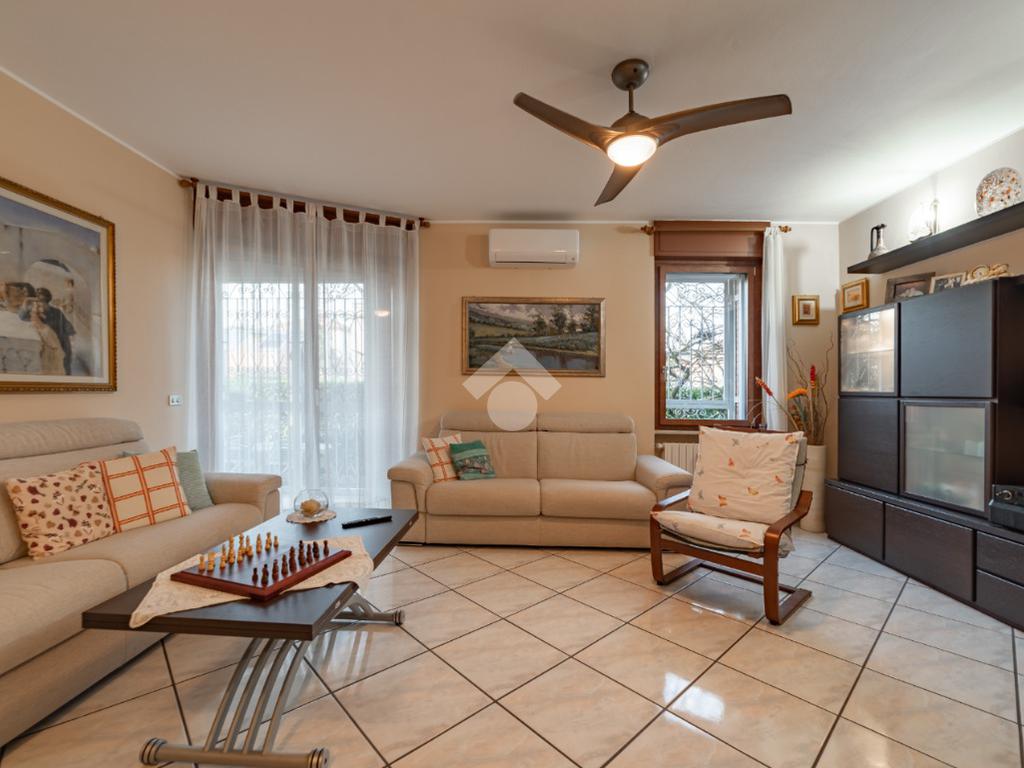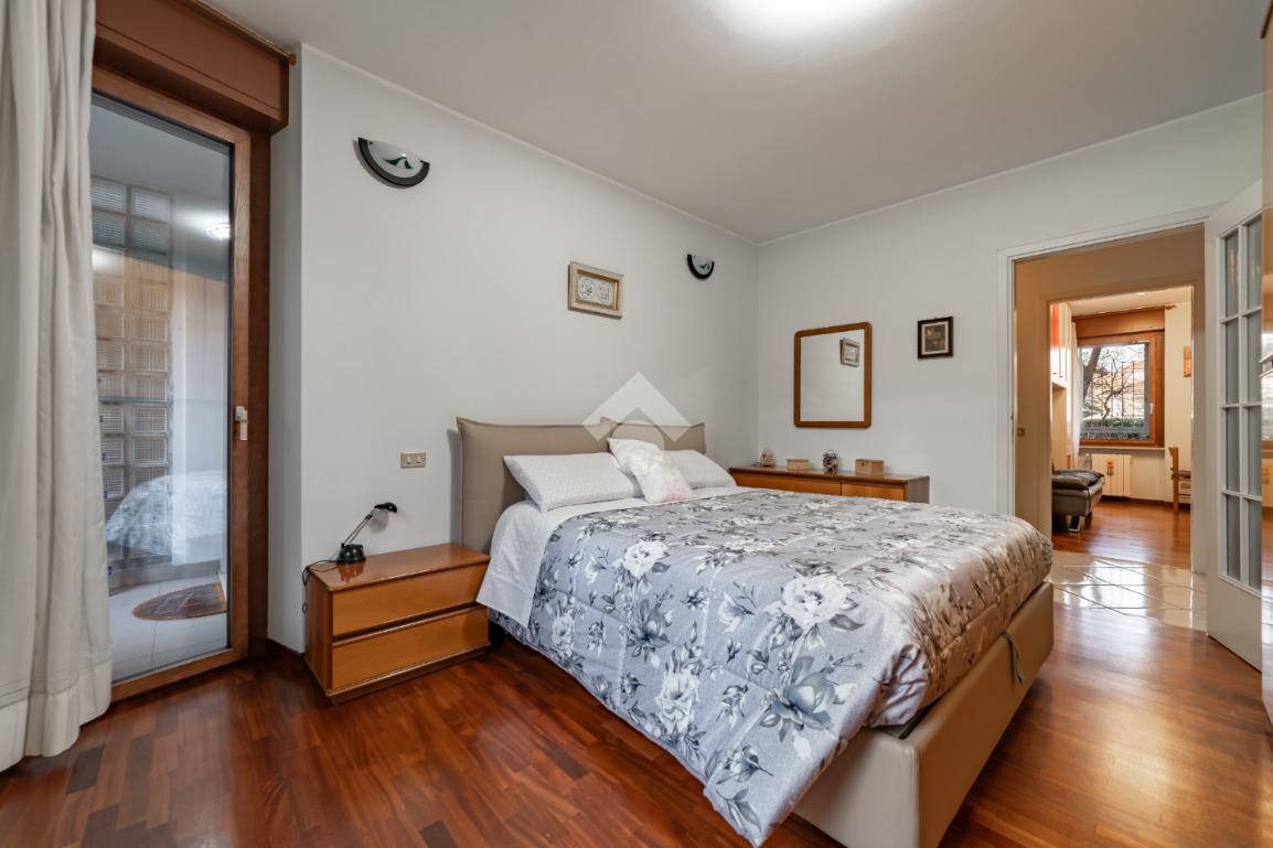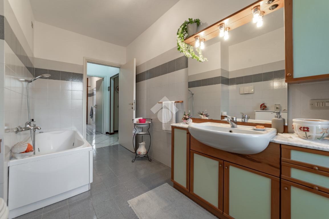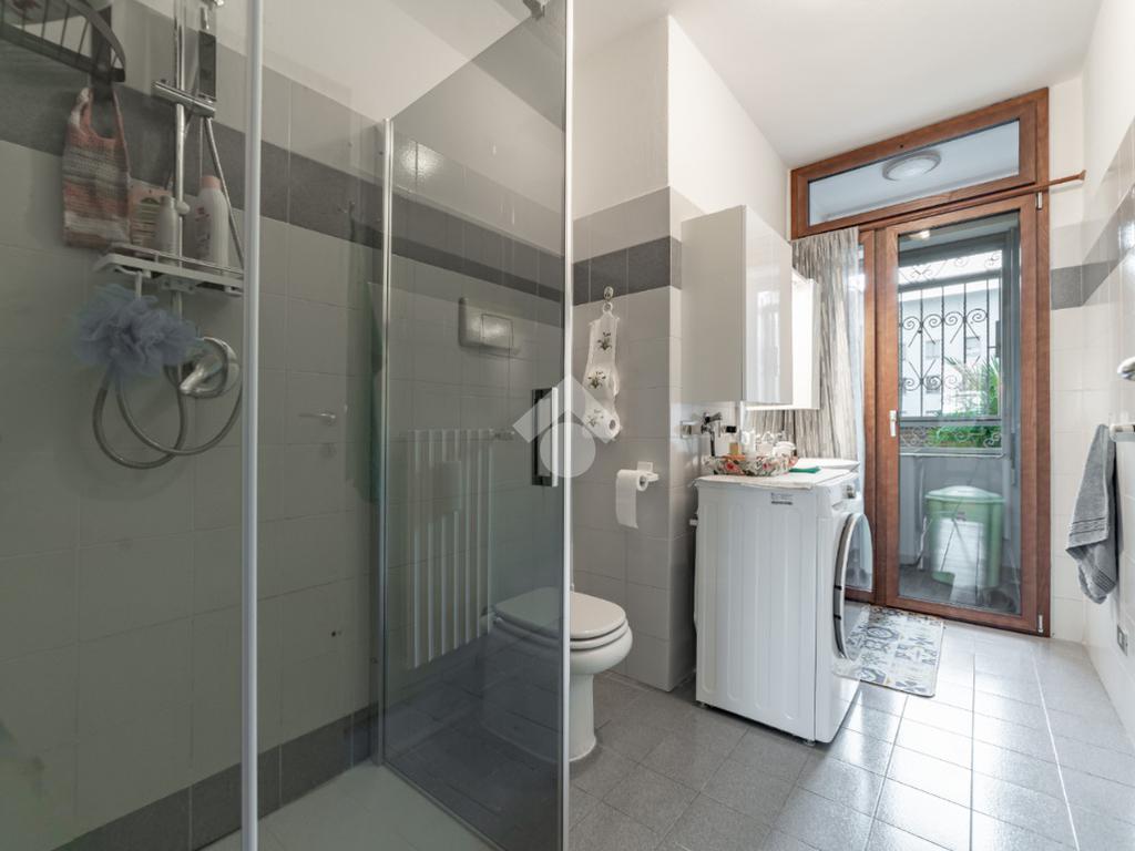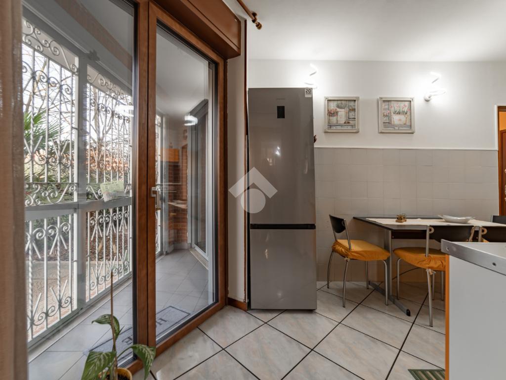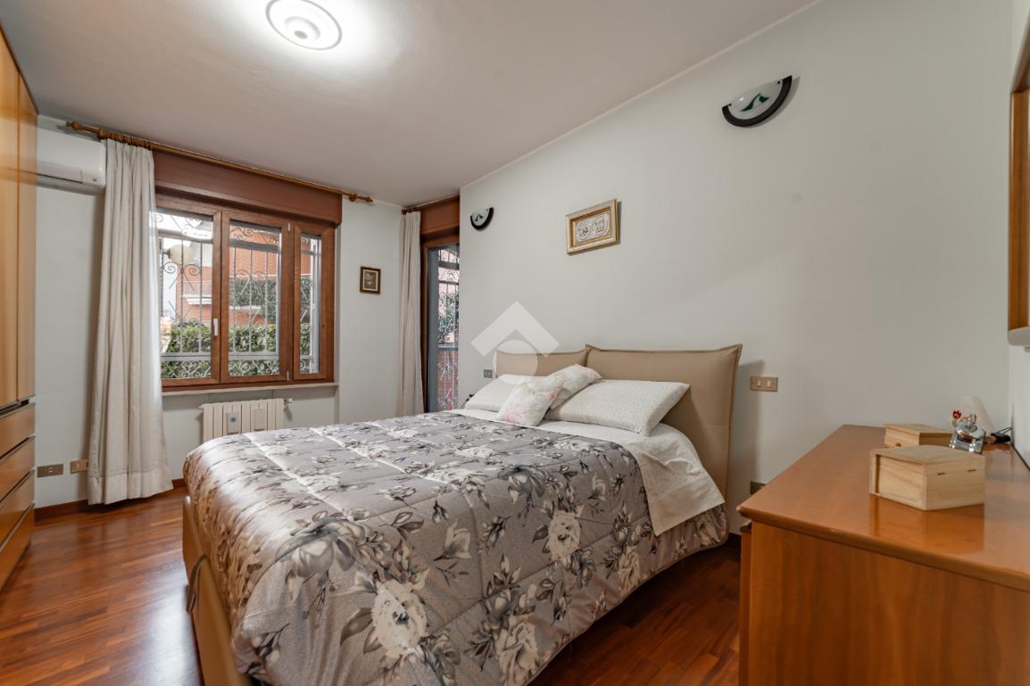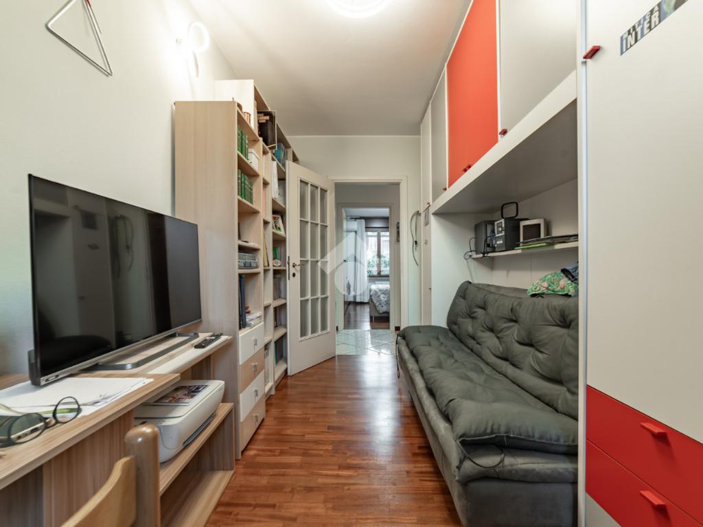 Posta al piano terreno con doppia esposizione (nord - sud), la soluzione da subito colpisce per il fatto di avere a disposizione due porzioni di giardino in uso esclusivo, una delle quali di ottime dimensioni e completamente attrezzata; l’ingresso avviene direttamente sul soggiorno dotato di finestra e porta finestra che permette l’accesso sia ad una piccola balconata coperta che al giardino lato nord. La cucina, pienamente abitabile, è subito adiacente, con due porte finestre comunicanti con altrettanti balconcini completamente coperti ed incassato, in uno dei quali trova posto una caldaia a condensazione ad alto rendimento, messa in opera circa due anni fa. La zona notte presenta un comodo disimpegno, una camera matrimoniale con finestra e porta finestra sul giardino posteriore, due camerette, una delle quali con porta finestra sulla porzione di giardino lato sud, il bagno principale di generosissime dimensioni, finestrato con vasca da bagno ed il bagno di servizio con cabina doccia e dotato di porta finestra con accesso ad un piccolo balconcino chiuso da un ulteriore serramento, particolarmente utile nella stagione fredda e piovosa.
