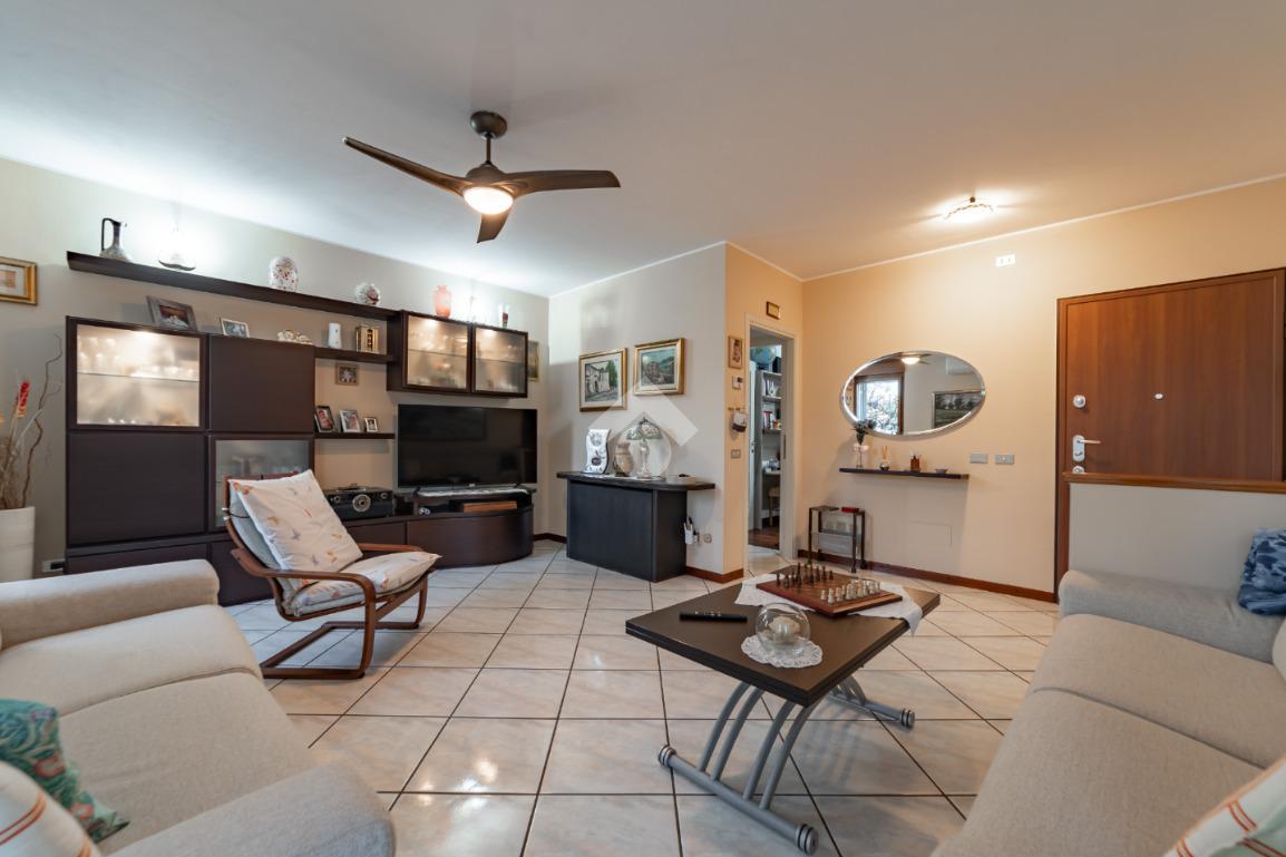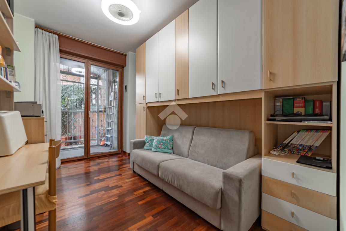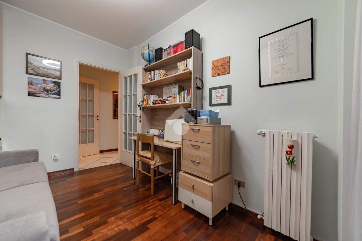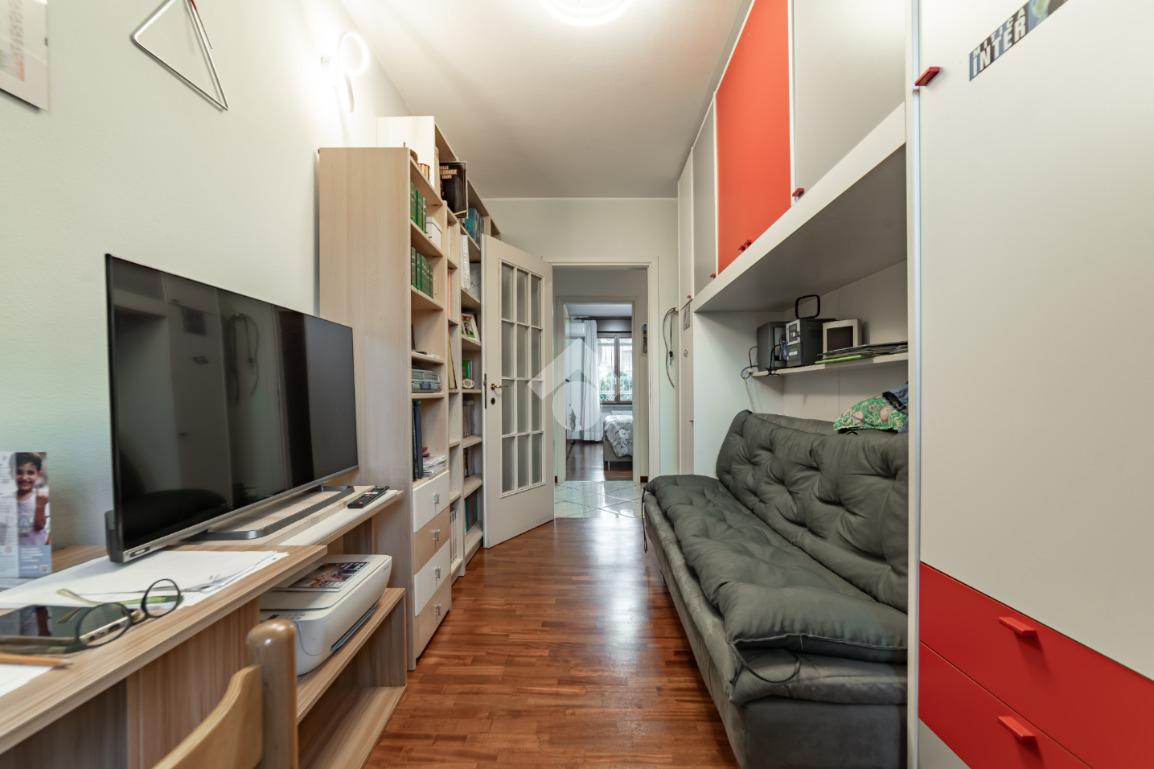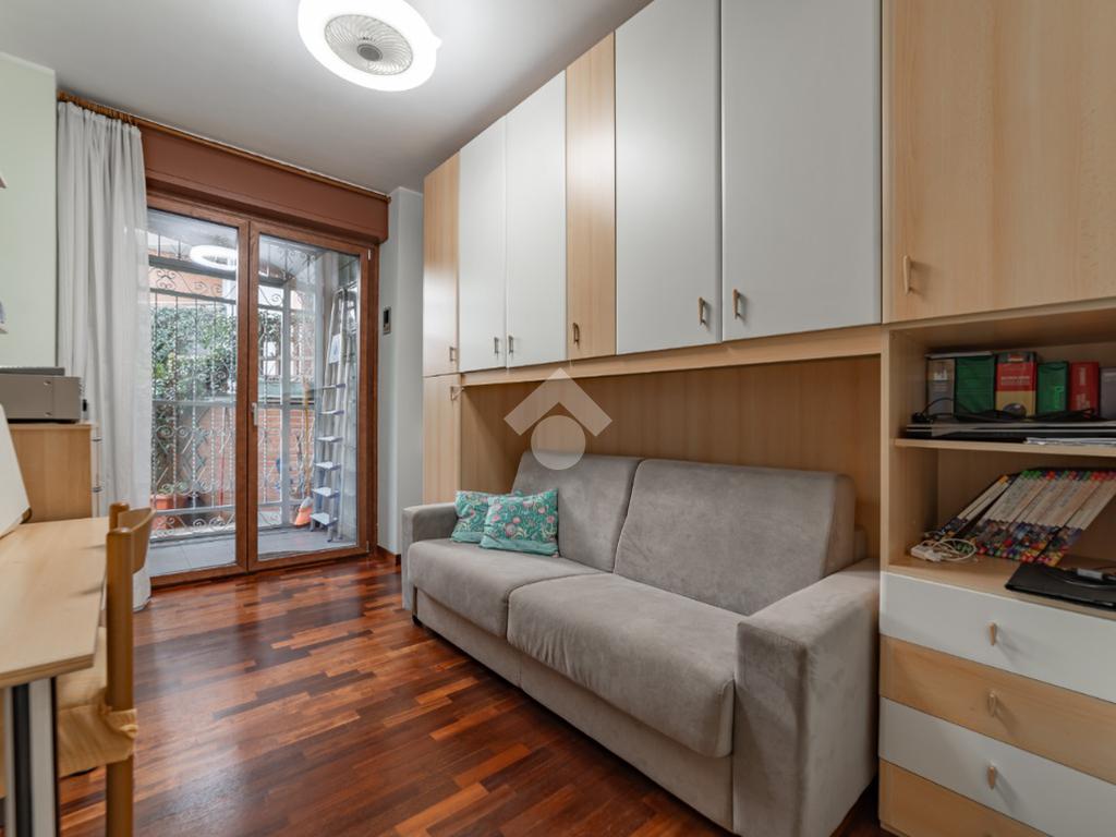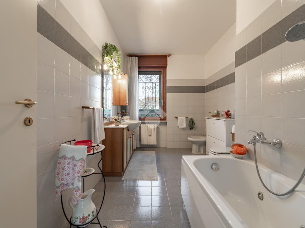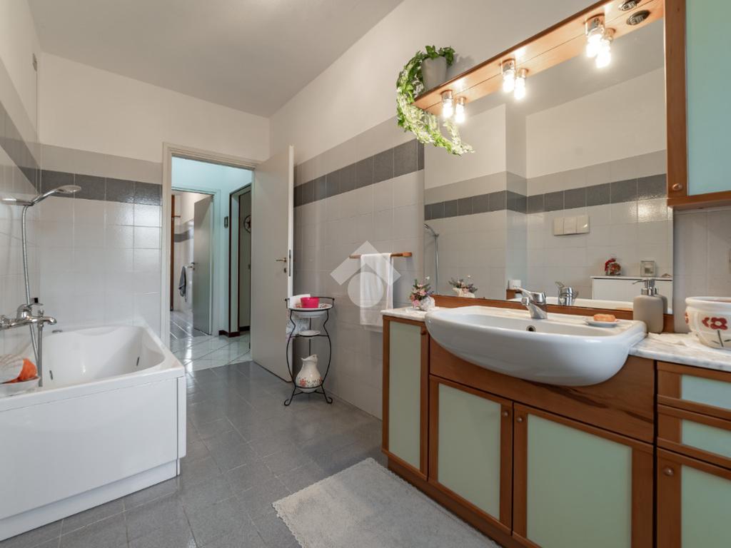 Posta al piano terreno con doppia esposizione (nord - sud), la soluzione da subito colpisce per il fatto di avere a disposizione due porzioni di giardino in uso esclusivo, una delle quali di ottime dimensioni e completamente attrezzata; l’ingresso avviene direttamente sul soggiorno dotato di finestra e porta finestra che permette l’accesso sia ad una piccola balconata coperta che al giardino lato nord. La cucina, pienamente abitabile, è subito adiacente, con due porte finestre comunicanti con altrettanti balconcini completamente coperti ed incassato, in uno dei quali trova posto una caldaia a condensazione ad alto rendimento, messa in opera circa due anni fa. La zona notte presenta un comodo disimpegno, una camera matrimoniale con finestra e porta finestra sul giardino posteriore, due camerette, una delle quali con porta finestra sulla porzione di giardino lato sud, il bagno principale di generosissime dimensioni, finestrato con vasca da bagno ed il bagno di servizio con cabina doccia e dotato di porta finestra con accesso ad un piccolo balconcino chiuso da un ulteriore serramento, particolarmente utile nella stagione fredda e piovosa.